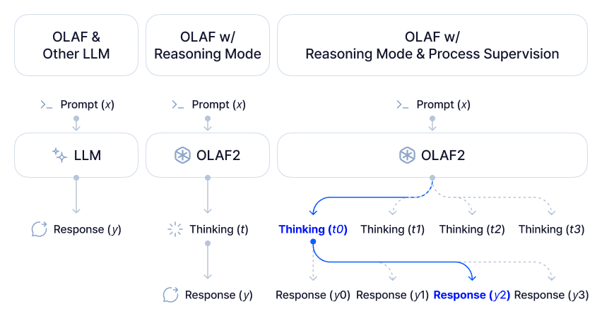 OpenAI o1의 추론 메커니즘으로 거론되는 추론 시간 스케일링 (Inference-Time Scaling)의 발전에 힘입어, OLAFv2는 Reasoning mode에서 더욱 길고 세부적인 추론 과정을 생성하도록 설계되었습니다. 학습 시점의 컴퓨팅 자원 대신 테스트 시점의 컴퓨팅 자원 확장에 주력하는 추론 시간 스케일링으로, 소형 모델도 그 잠재력을 최대한 발휘할 수 있게 됩니다. 이는 대규모 모델을 배포하기 어려운 하드웨어 제약이 걸린 환경에서 특히 유리합니다. 자세한 내용은 최근에 포스팅한 HRM8K 블로그의 “Scaling Test-Time Compute” 섹션을 참고하시기 바랍니다.