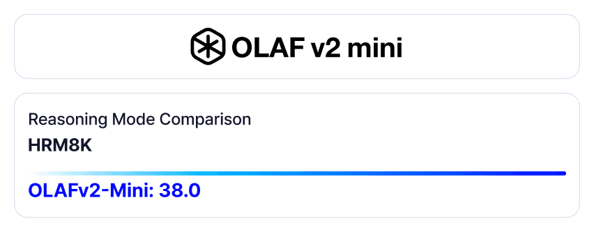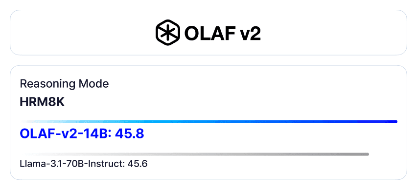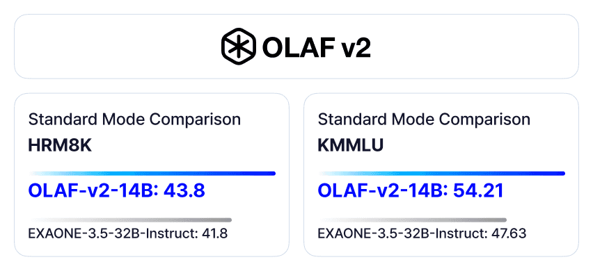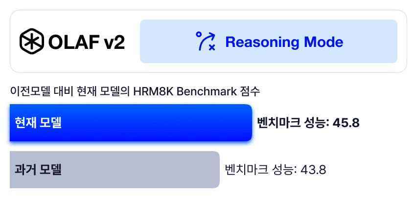 OLAFv2의 Reasoning mode는 복잡한 한국어 수학 추론 문제로 구성된 HRM8K 벤치마크에서 성능을 43.8에서 45.8로 크게 향상시켰습니다. 이 기능을 통해 소형 모델도 대형 모델에 근접한 추론 성능을 달성하면서, 자원이 제한된 소형 사내 서버 환경에서도 강력한 추론 기능을 제공하는 고품질 언어 모델을 활용할 수 있습니다.
