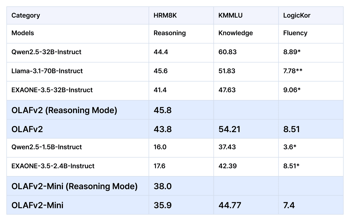 *은 EXAONE3.5 Techincal Report에서 발췌한 점수를 의미함