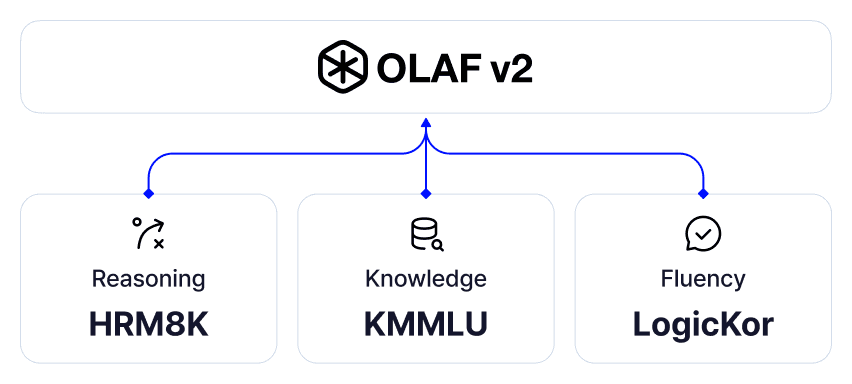 Reasoning(추론), Knowledge(지식), Fluency(유창성) 이렇게 3가지의 카테고리에서 OLAF2 모델을 평가하였습니다.