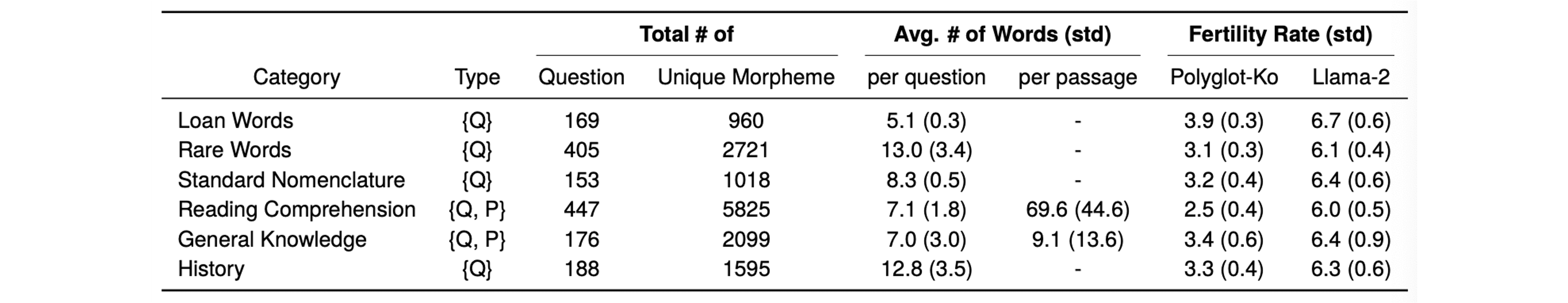 HAE-RAE Bench의 Fertility Rate를 분석하여 각 모델이 한국어 단어를 어떻게 처리하는지 평가했습니다. 여기서 Fertility는 단어 당 생성되는 sub-token(하위 토큰)의 평균 수를 측정한 값으로, 이 수치가 높을수록 해당 모델이 한국어 어휘를 이해하는데 어려움을 겪을 가능성이 큽니다. Polyglot-Ko, Llama-2 등의 모델의 Fertility를 비교한 결과, 한국어를 중심으로 학습된 Polyglot-Ko 모델이 Llama-2보다 더 낮은 Fertility Rate를 보이며 한국어 어휘를 더 잘 처리함을 알 수 있습니다.