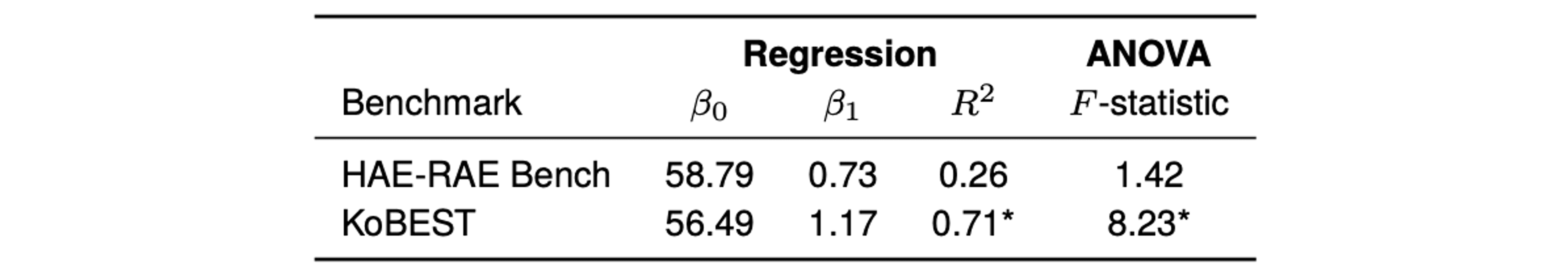 HAE-RAE Bench와 KoBEST에 대한 선형 회귀 및 ANOVA 분석 결과