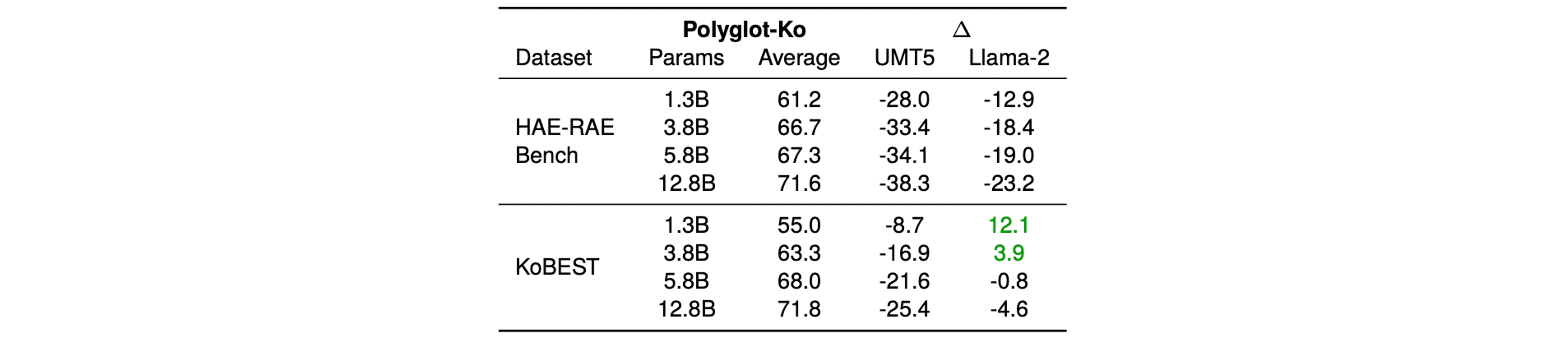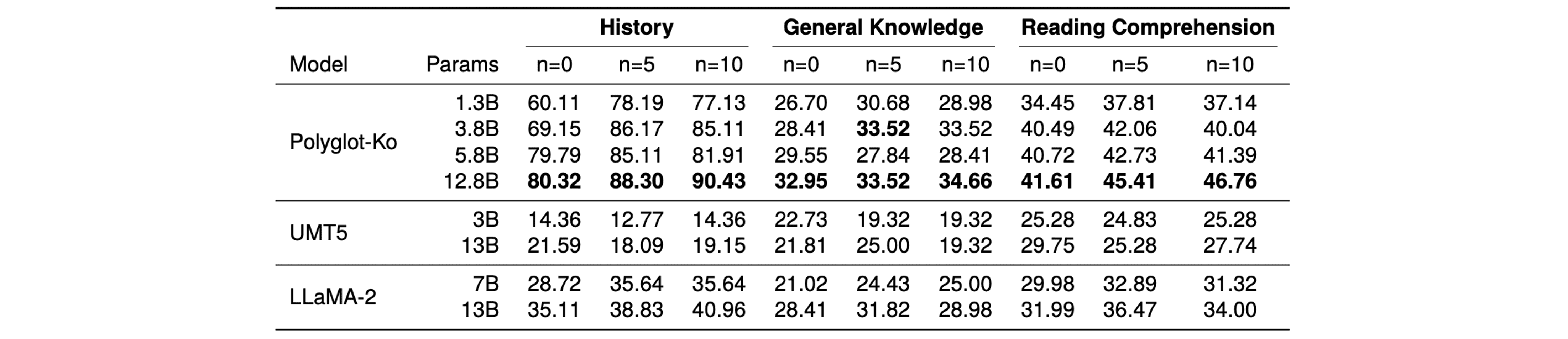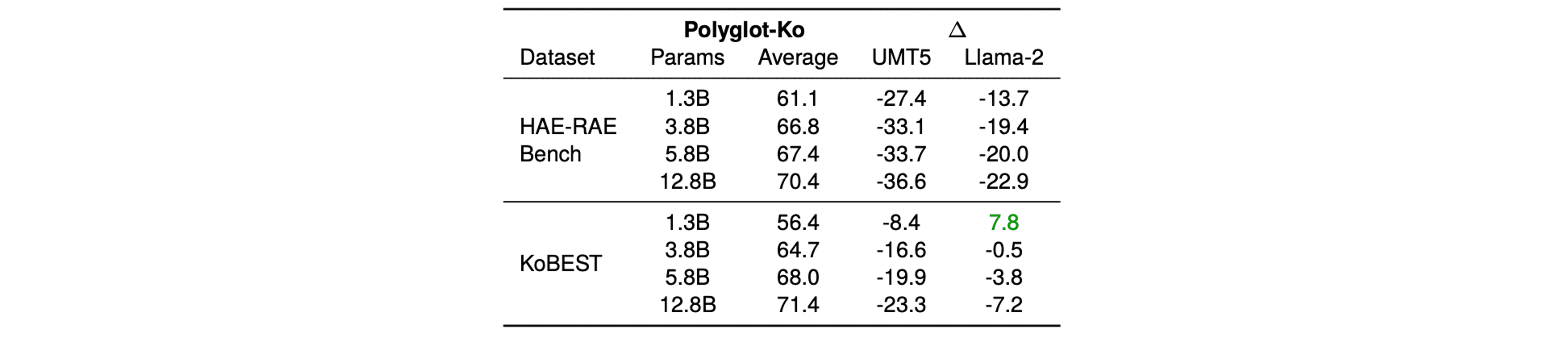Polyglot-Ko 모델이 UMT5나 Llama-2에 비해 월등히 높은 성능을 보였습니다. 특히, Polyglot-Ko의 가장 작은 모델인 1.3B 모델이 훨씬 큰 규모의 UMT5와 Llama-2 모델보다 뛰어난 성능을 보였습니다. 이는 언어별 특화 코퍼스가 모델문화적 맥락 이해에 중요한 역할을 한다는 점을 보여줍니다.