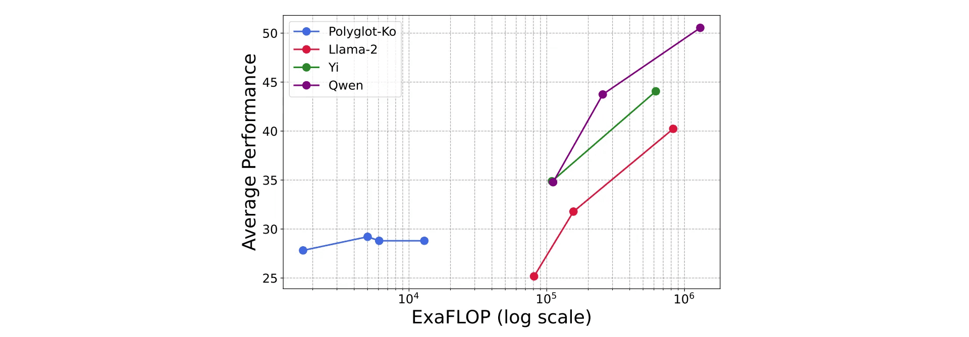 KMMLU 평가 결과는 모델의 성능이 모델의 사전 학습에 사용된 계산 자원(ExaFLOP, 10^18 부동소수점 연산으로 6 × #param × #tokens으로 계산)에 비례하여 증가하는 경향을 보여줍니다. 위 그래프를 보면 알 수 있듯이 Polyglot-Ko는 한국어 특화 모델로 학습되었음에도 불구하고, 다른 모델들에 비해 더 적은 학습 비용으로 인해 성능이 크게 떨어지는 것을 확인할 수 있습니다. 이는 충분한 데이터와 계산 자원을 활용한 장기 학습이 모델의 언어 이해 능력을 강화하는 데 중요하다는 점을 시사합니다.