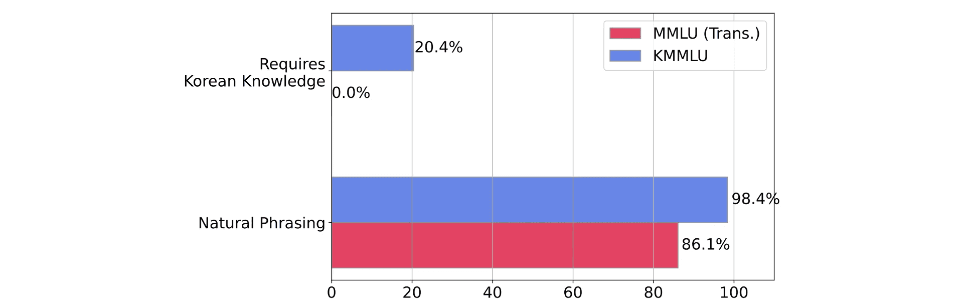 추가적으로 KMMLU와 기존 영어 중심의 MMLU를 번역한 벤치마크 간의 한국 문화와 언어적 특성을 반영한 설계 차이를 분석하였습니다. 이를 위해 연구팀은 번역된 MMLU와 KMMLU를 다음 두 가지 측면에서 비교하였고, 비교 결과는 위 그래프와 같습니다: