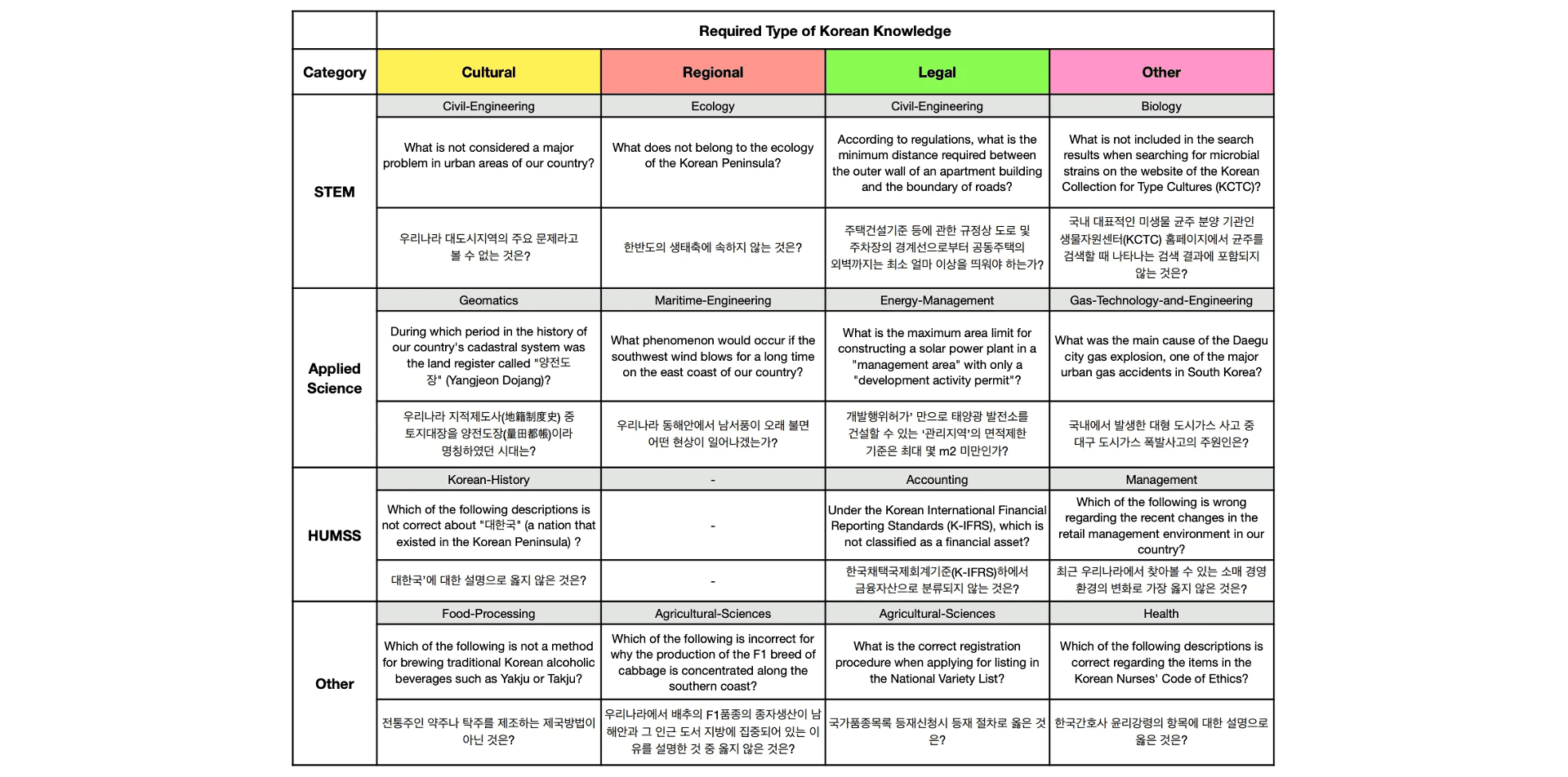 질문의 자연스러운 언어적 흐름과 한국 고유의 문화적 맥락을 보장했습니다. 이는 영어 기반 벤치마크를 번역한 데이터에서 종종 발생하는 비자연스러운 표현이나 문법 오류를 방지합니다.