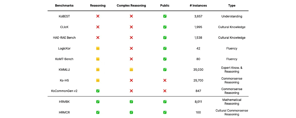 Reasoning: Benchmarks used to evaluate a language model's ability to reasoning in Korean. These tasks range from basic Korean knowledge to complex scenarios that require specialized knowledge and logical inference. However, these benchmarks are outdated or limited by the domain, making it challenging to evaluate the model's complex reasoning capabilities: KoBEST, KMMLU, Ko-H5, KoCommonGen v2, etc.