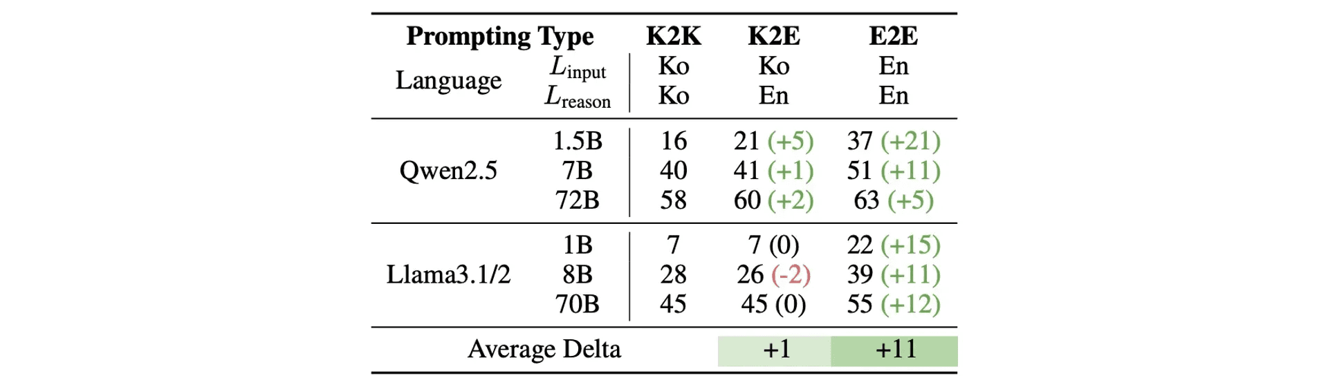 Effect of reasoning language: In contrast, comparing K2K to K2E shows an average difference of only 1%, suggesting that the language of the reasoning process has a relatively small impact once the model has already ingested Korean input. Simply allowing the model to produce its chain-of-thought in English does not fully recover performance lost from reading a Korean prompt.