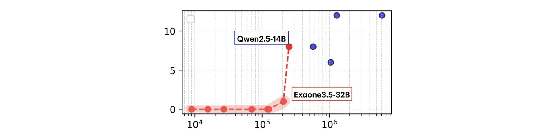 Computational resources: EXAONE3.5-32B, despite its size, shows near-zero performance on the benchmark. On the other hand, as shown in the following figure(X-axis: ExaFLOPs(10^18) training compute scale, Y-axis: HRMCR performance), Qwen-2.5-14B, despite a much smaller model size, demonstrates superior performance compared to EXAONE-3.5-32B due to its higher training compute. This indicates that solving HRMCR requires not just model scale but also advanced training strategies and sufficient computational resources.