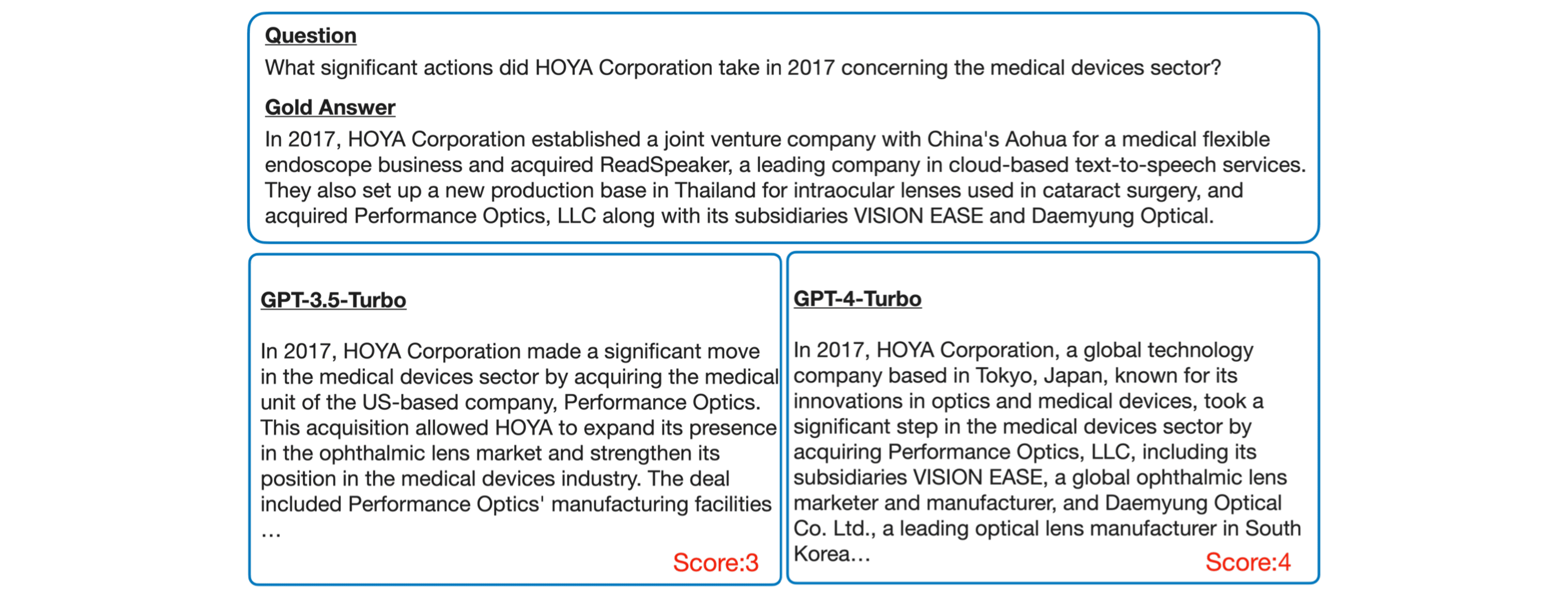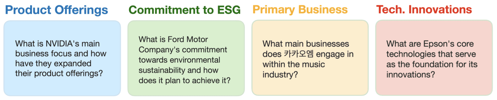 이러한 결과는 영어로 된 일본 및 한국 기업 관련 자료의 부족, 추가 학습 과정에서의 catastrophic forgetting 등 여러 요인에 기인할 수 있습니다. 또한 더 어려운 문서(예: 내부 문서)를 입력으로 사용하면 벤치마크의 난이도를 쉽게 높일 수 있음을 시사