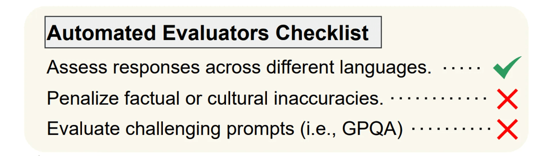 결론적으로, LLM을 평가하는 자동화된 방법론이 점점 발전하고 있지만, 여전히 인간 평가자의 역할을 완전히 대체하기에는 부족함이 많습니다. 향후 연구는 평가 모델이 보다 정밀하게 사실 검증을 수행하고, 문화적 맥락을 이해하며, 난이도 높은 질문을 공정하고 정확하게 평가할 수 있도록 발전하는 방향으로 나아가야 할 것입니다.