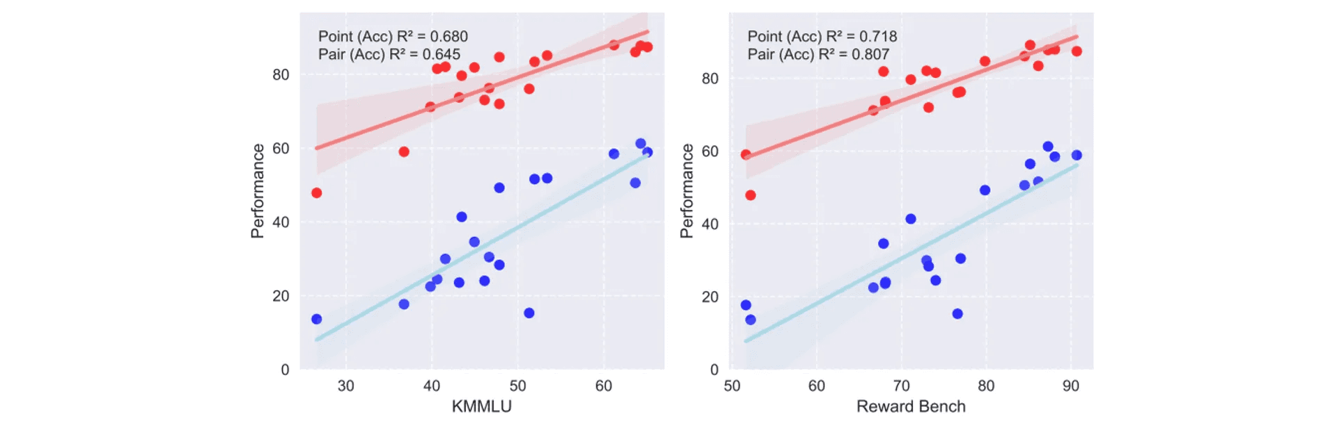 앞선 KUDGE Original Subset의 평가 결과를 보면, 대부분의 모델이 영어로 학습되었음에도 불구하고, 한국어 평가를 준수하게 진행하는 것을 확인할 수 있습니다. 이러한 관점에서 “평가 능력이 다른 언어로도 전이될 수 있을까?”의 의문점을 해결하기 위해 언어 모델이 영어에서 학습한 평가 능력을 한국어와 같은 전혀 다른 언어에서도 발휘할 수 있는지를 실험했습니다. 실험을 위해 KMMLU를 활용하여 모델의 한국어 성능을 평가하였고, RewardBench를 활용하여 영어 평가 능력을 평가하여 KUDGE score 간의 regression을 계산하였습니다.