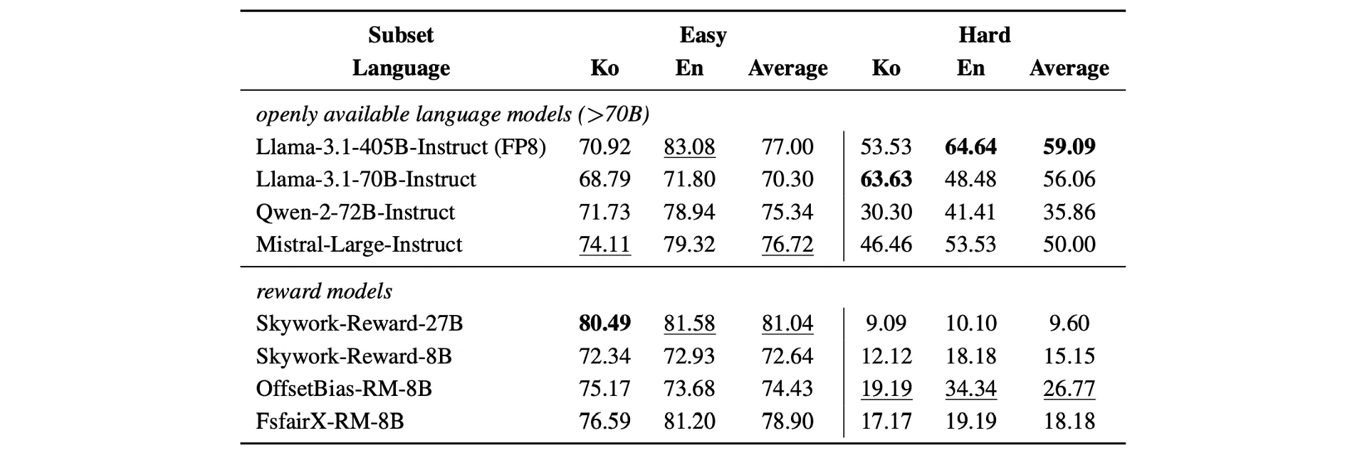 Hard 카테고리의 큰 성능 저하. 대부분의 모델이 낮은 성능을 보였고, 일부 Reward Model은 랜덤 추측(50%)보다 낮은 성능을 기록함.