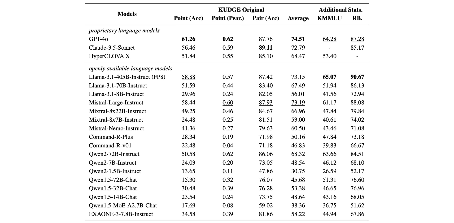 KUDGE Original Subset 평가 결과