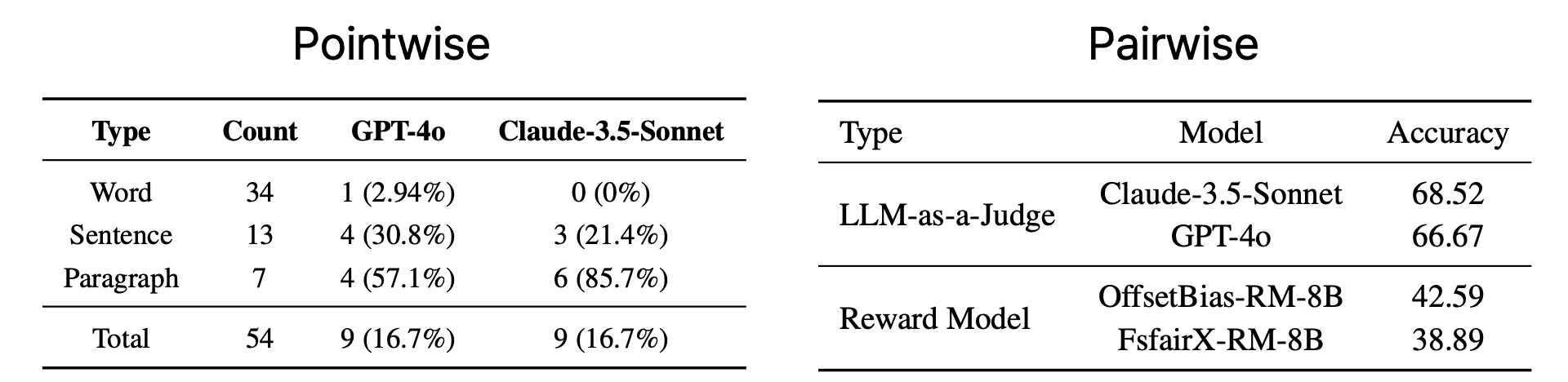 Pairwise 평가: 원본 응답과 거짓 정보를 포함한 응답을 비교하고 올바른 응답을 선택하는지 확인. Pointwise보다 전반적으로 나은 성능을 보여줬지만, 작은 사이즈의 Reward Model은 50% 이하의 정확도를 보여주며, 사실 확인 능력이 낮았음.