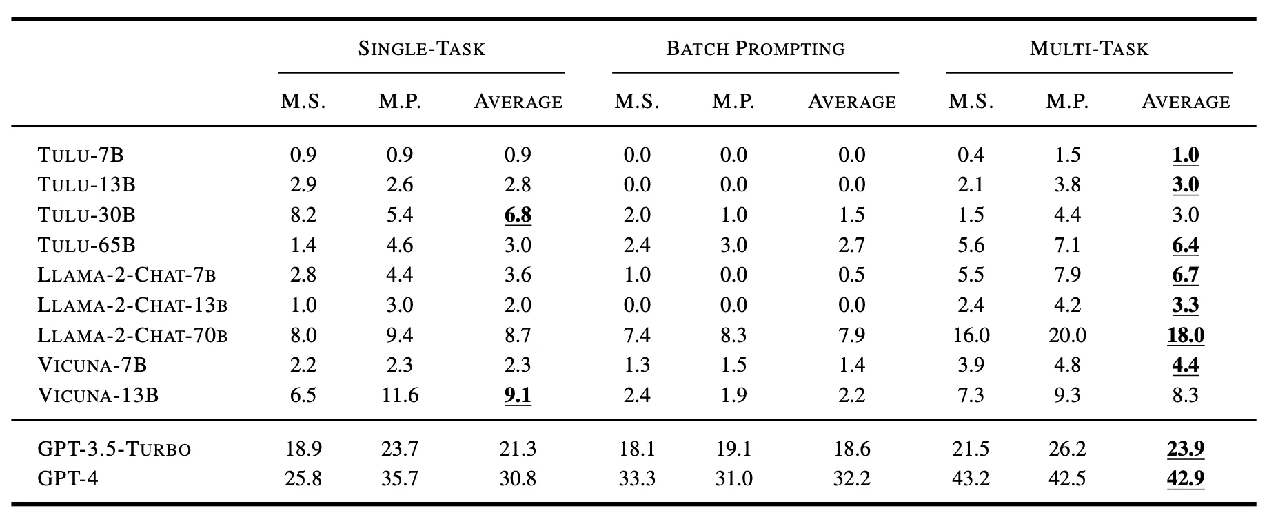 Multi-Task Inference의 성능: Multi-Task Inference는 Single-Task Inference 및 Batch Prompting과 비교했을 때 일관되게 높은 성능을 보여주었습니다. 또한 실험 결과는 모델의 크기와 성능 간에 강한 상관관계를 보이며 모델의 크기가 커질수록 강력한 Multi-Task Inference 성능을 보여줬습니다.