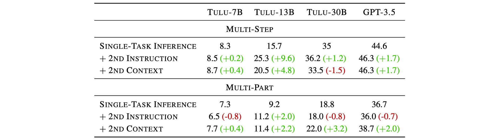 Multi-Task Inference와 Single-Task Inference의 차이 분석: Multi-Task Inference는 Single-Task Inference에 비해 평균적으로 7.3~12.4% 높은 정확도를 보여주는데, 이는 하위 task 간의 연관성이 높은 Multi-Step에서는 크게 나타나지만 하위 task 간의 연관성이 낮은 Multi-Part에서는 상대적으로 성능 차이가 작게 나타나는 것을 확인할 수 있습니다. Single-Task Inference는 첫 번째 task만을 해결한 후 다음 task로 넘어가는 방식인 반면, Multi-Task Inference는 모든 task의 정보를 한 번에 제공하여, 이로 인해 다음 task의 정보를 미리 참조 (look-ahead)하여 초기 작업을 더 잘 수행하는 경향이 다음의 표를 통해 확인되었습니다.