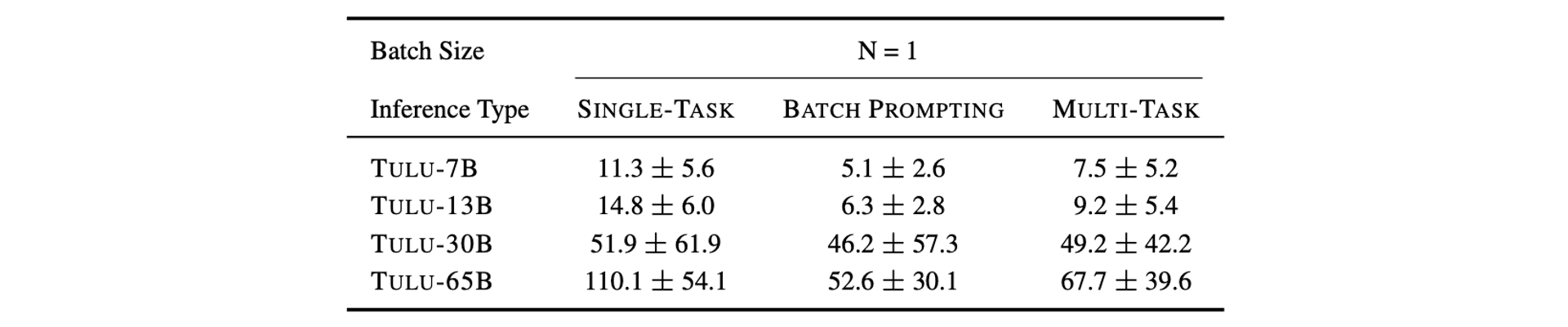 Multi-Task Inference의 효율성: Multi-Task Inference는 Single-Task Inference 대비 평균적으로 1.46배 더 빠른 처리 속도를 기록했습니다. 이는 하위 task마다 별도의 추론 단계를 거치지 않고 한 번의 프롬프트로 작업을 처리하기 때문입니다. 반면에 Batch Prompting은 Single-Task Inference 대비 평균적으로 2.1배 더 빠른 처리 속도를 기록하며 가장 빠른 추론 속도를 보였지만, Multi-Task Inference에 비해 현저히 떨어지는 다중 작업 처리 능력을 보여주면서 Multi-Task Inference의 성능 및 효율성을 입증하였습니다.