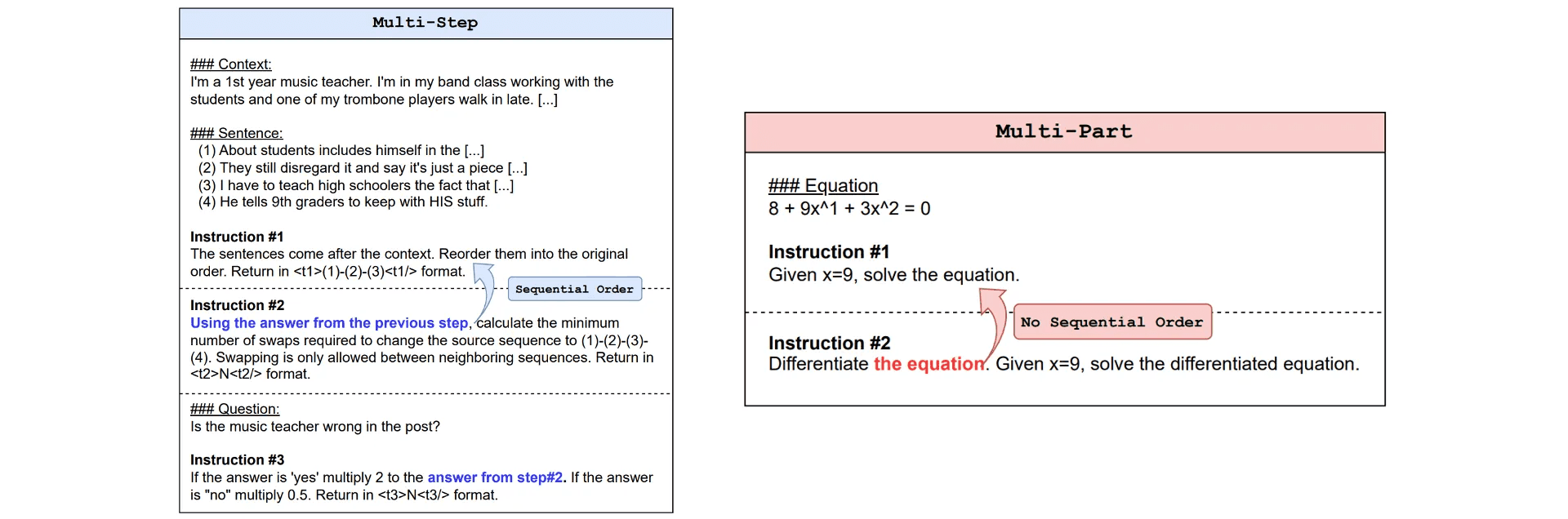 Multi-Part(이미지 오른쪽): 작업 간 의존성이 없는 상호 독립적인 작업들을 다루며 모델이 상호 독립적인 task를 올바르게 수행하는가를 측정합니다. 즉, 문맥적으로 어느 정도 상통하지만, 완전히 독립적인 task를 모델이 능숙하게 수행할 수 있는가를 평가합니다.